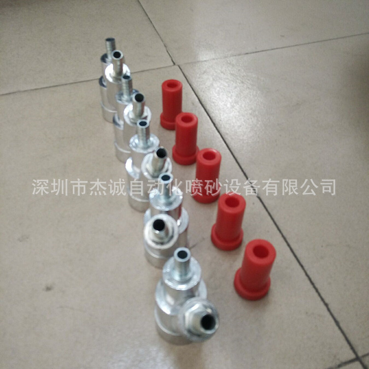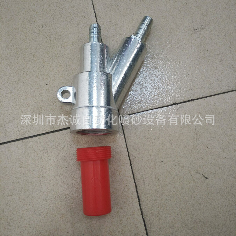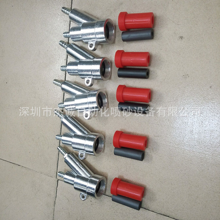 ●b型喷枪:管线型和肋型两种:管线型是将吸砂管直接插入到管线中的喷枪,管线型是指比肋式喷枪的出砂量大。从气芯进入到枪身底部喷嘴套的肋的长度为9cm,枪身的厚度约为4cm。空芯较细,枪身内部的砂料有较大的循环空间,合适大颗粒砂的注入。